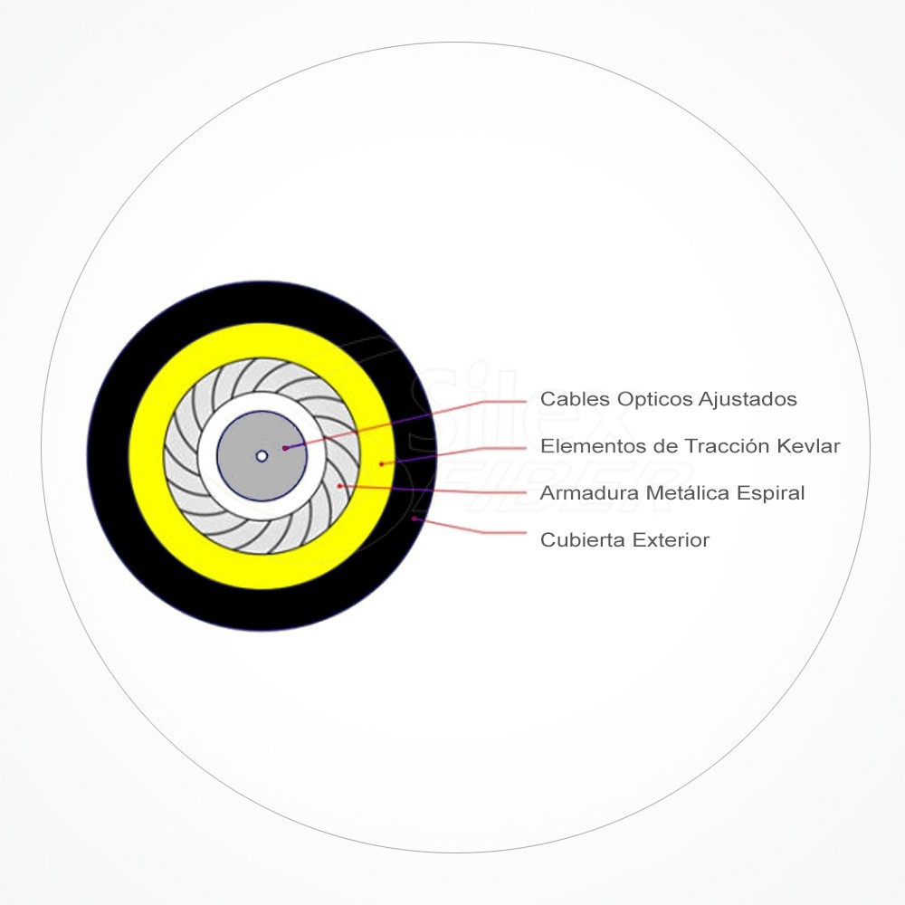 Tiene una cubierta exterior de Termoplástico LSZH (Libre de halógenos con baja emisión de humo), como elementos de tracción de Kevlar que aportan resistencia contra grandes tensiones, con un blindaje interior de acero proporciona una buena protección mecánica y antiroedores + el buffer ajustado de 900um.